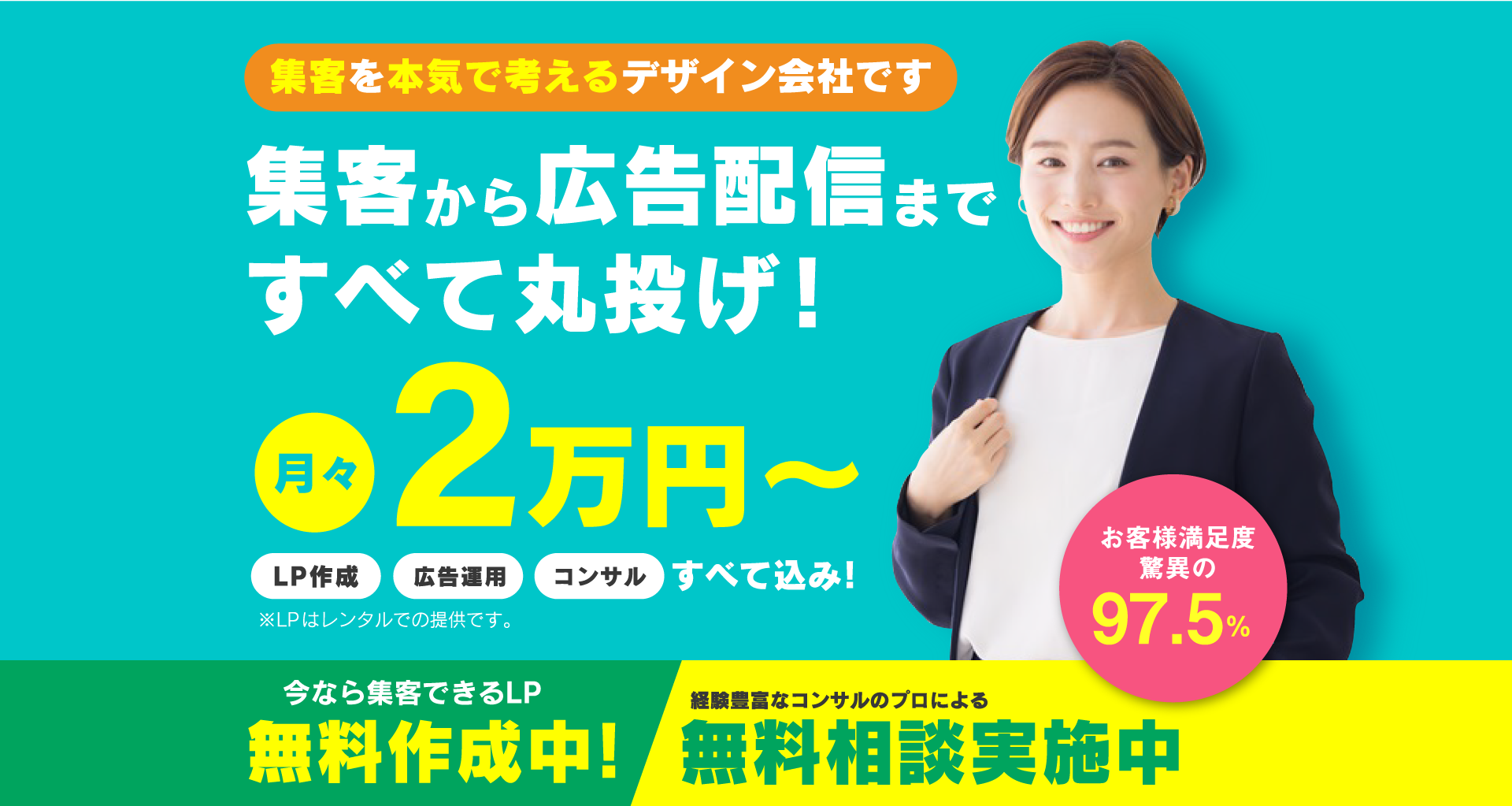 LP作成代+広告費+広告運用費+広告コンサル代すべてコミコミで月2万円~ご提供しております。
