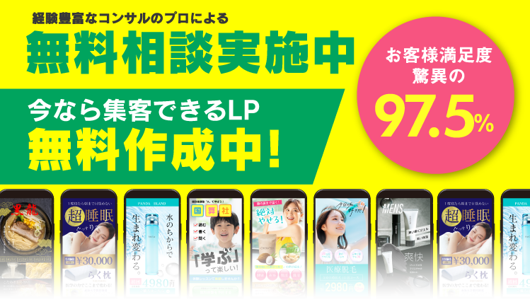 集客できるLP作成から顧客のターゲット設定、広告運用、広告改善まで電話一本ですべてお任せください。集客に特化したLPを無料作成中!